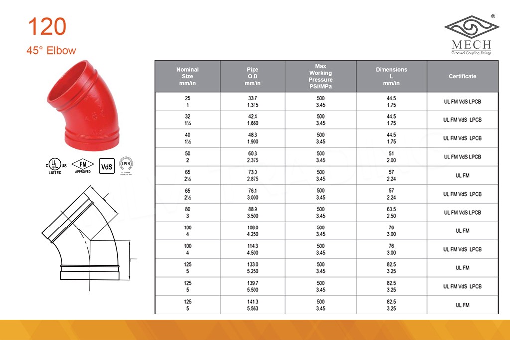 ข้องอ 45 (Grooved) MECH ใช้เฉพาะกับท่อ BS และท่อ ASTM 33.7 มม. (1")