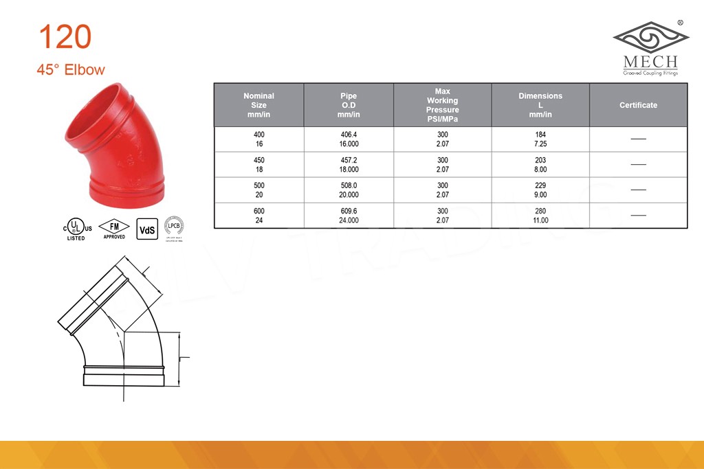 ข้องอ 45 (Grooved) MECH ใช้เฉพาะกับท่อ BS และท่อ ASTM 33.7 มม. (1")
