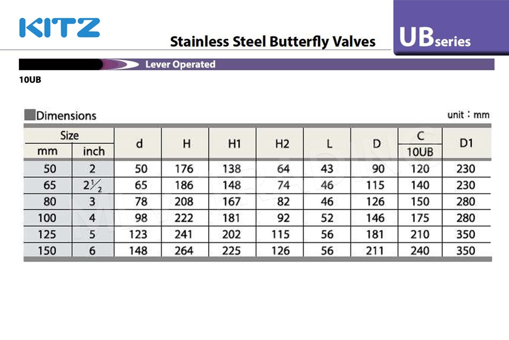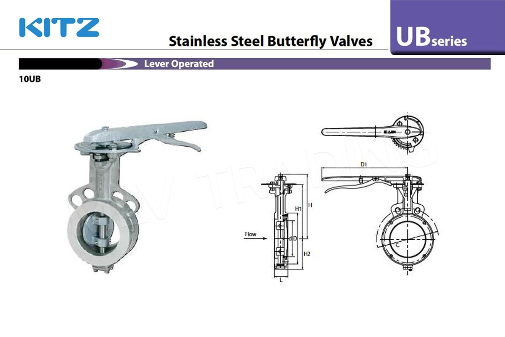 วาล์วผีเสื้อสเตนเลส316 ด้ามโยก เทปล่อน10K รุ่น 10UBM KITZ